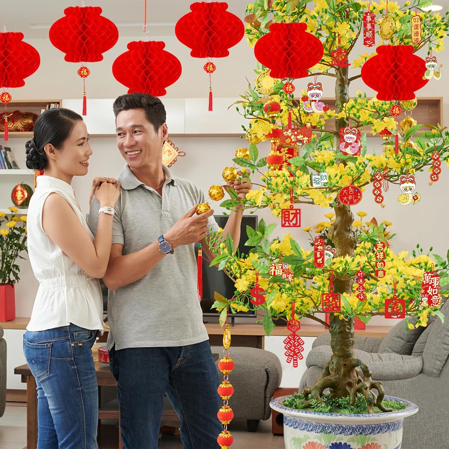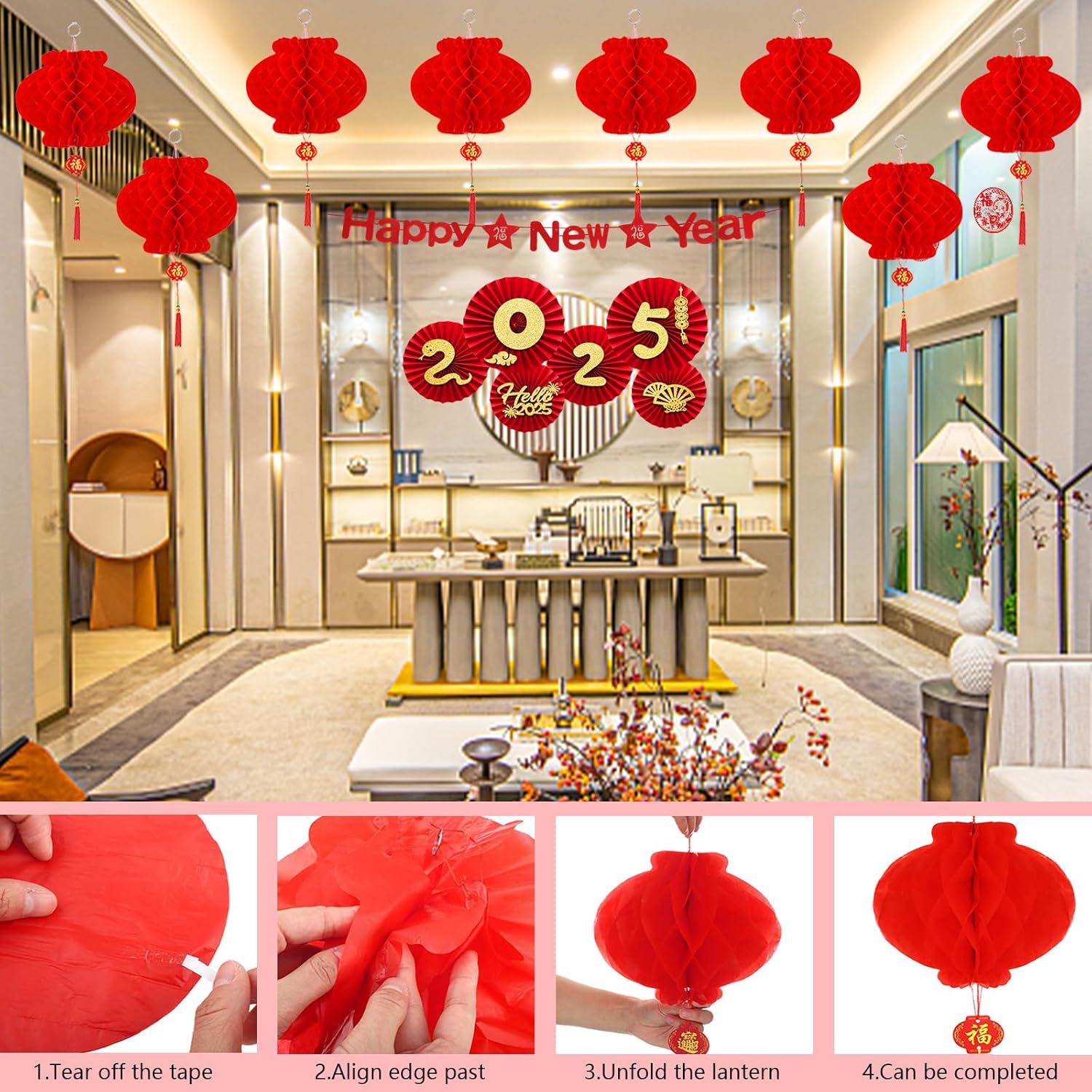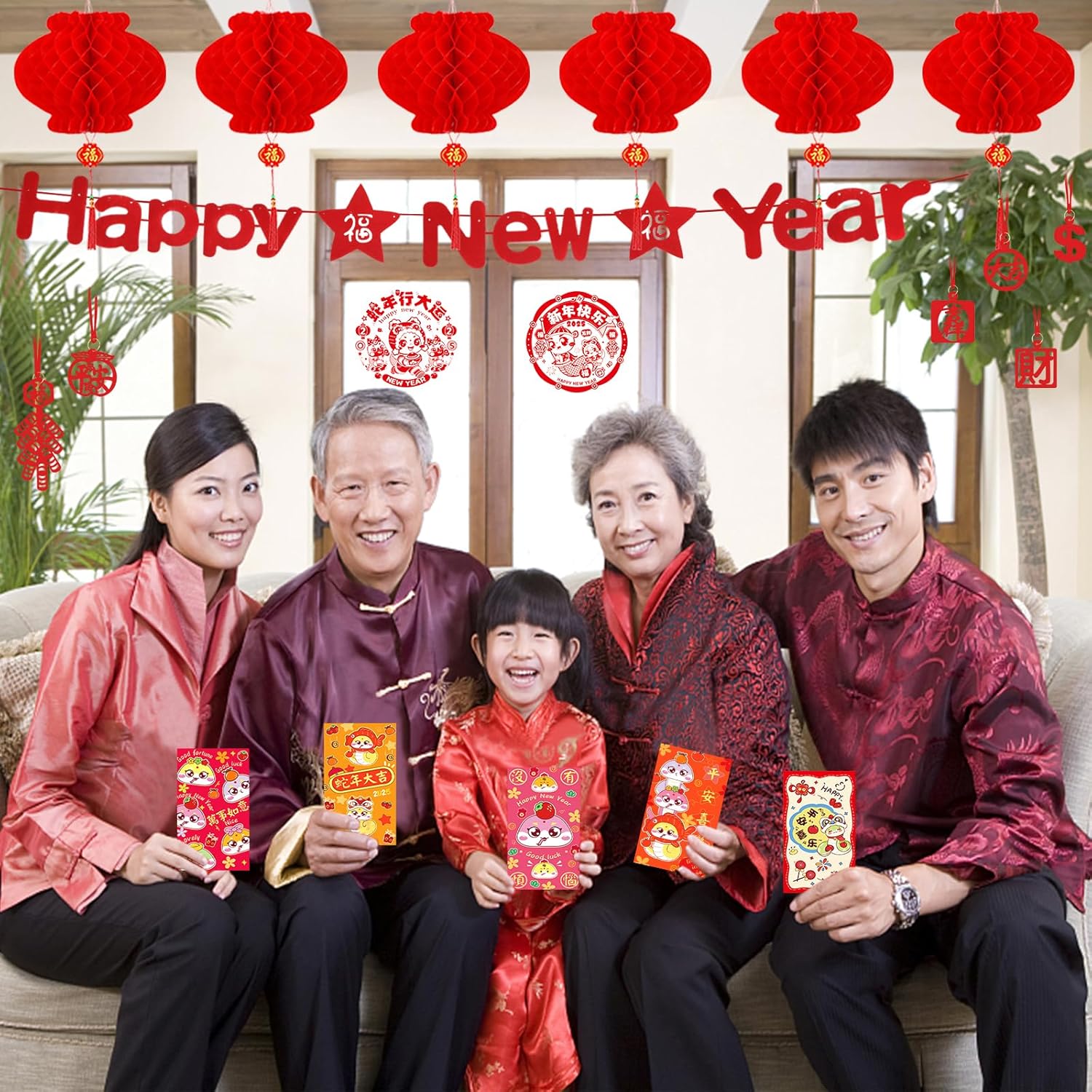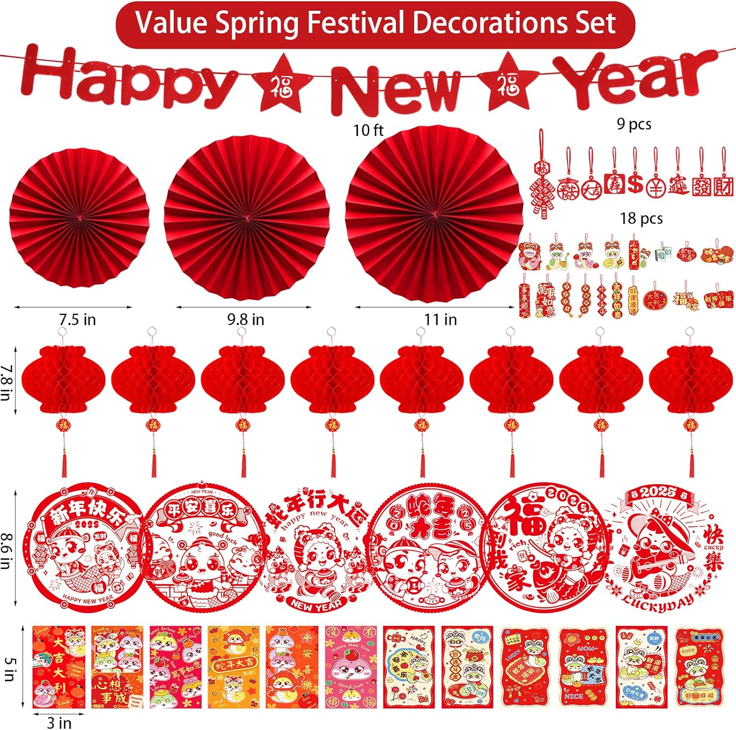 - Chinese Spring Festival Decorations: Chinese New Year decorations 2025 include a Happy New Year banner, 1 set of red paper fans decoration, 8 Chinese red lanterns festival decorations, 12 snake red envelopes, 18 felt and paper Chinese lucky hanging ornaments and 6 Chinese Fu character window clings. Chinese New Year hanging ornaments can serve your more festival decorative needs.