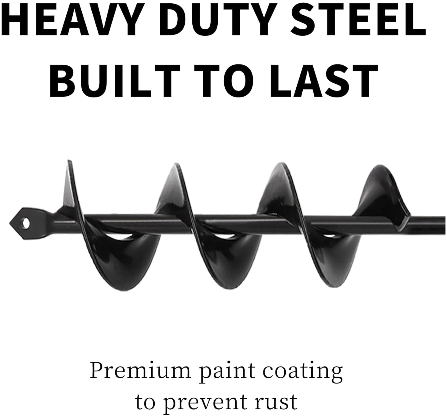 - Build to last: Made of heavy duty steel, with glossy black painted finish. The auger drill bit point on it hits the ground first and keeps it steady when you are digging hard grounds. Our patented design also makes the distance between the digging blade start and the point is the minimal, so auger drill bit will start working on hard ground without having to push down.