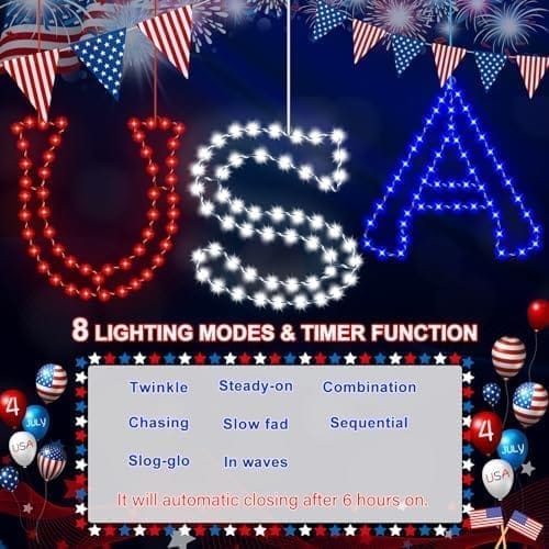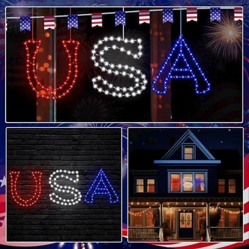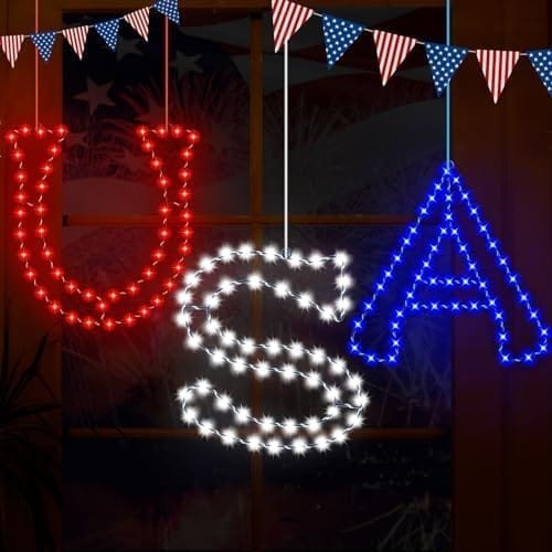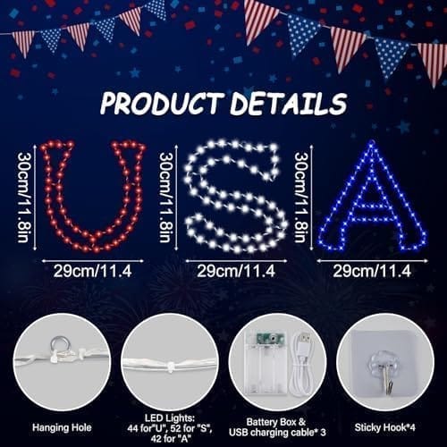 - 【3 Pack Fourth of July Window Silhouette Lights】The package includes a “U”, “S” and “A” sign, 4 suction cup, a USB charging cable. The whole “USA” window lights have 138 LEDs that much more bright and the electric wire about 6.6ft that can help you hide wire and battery boxes.