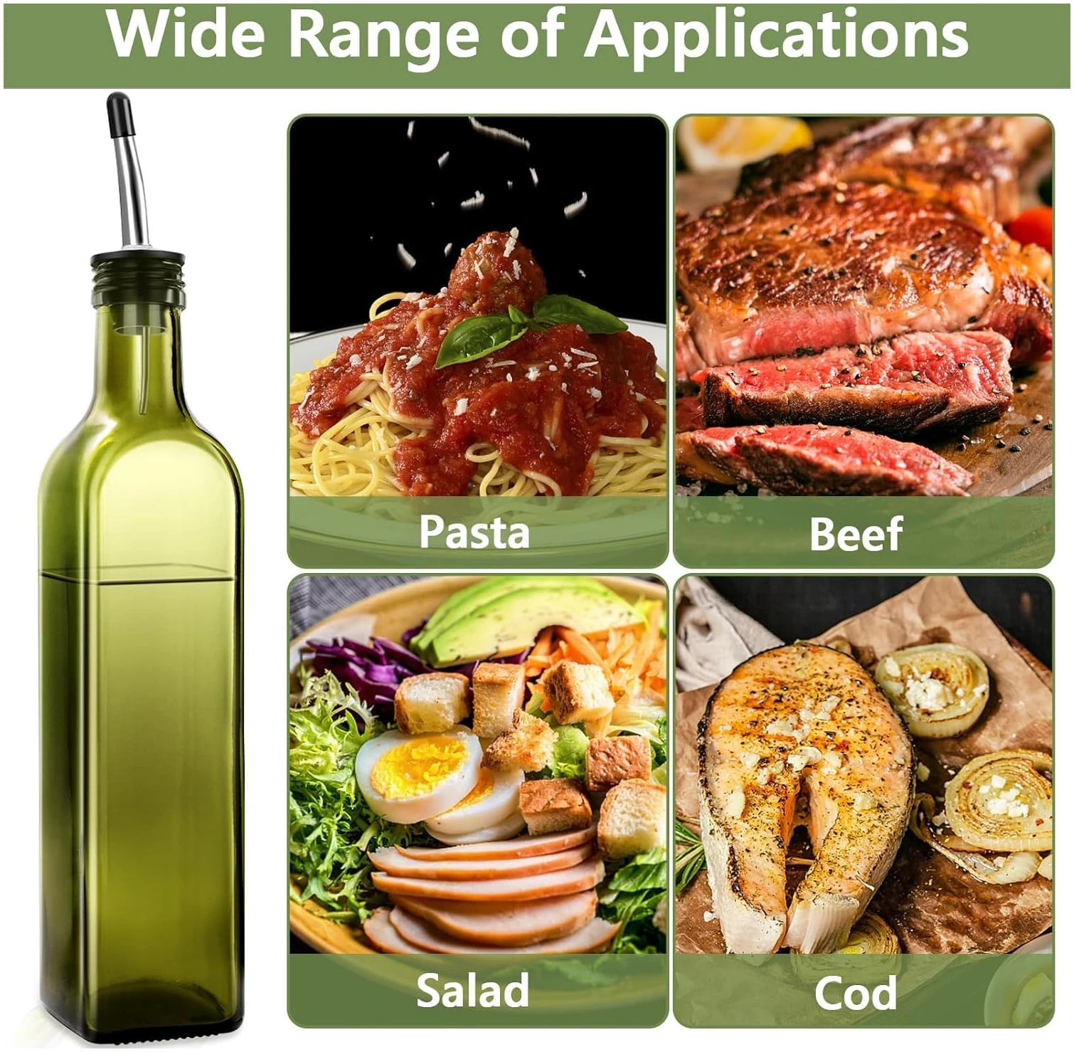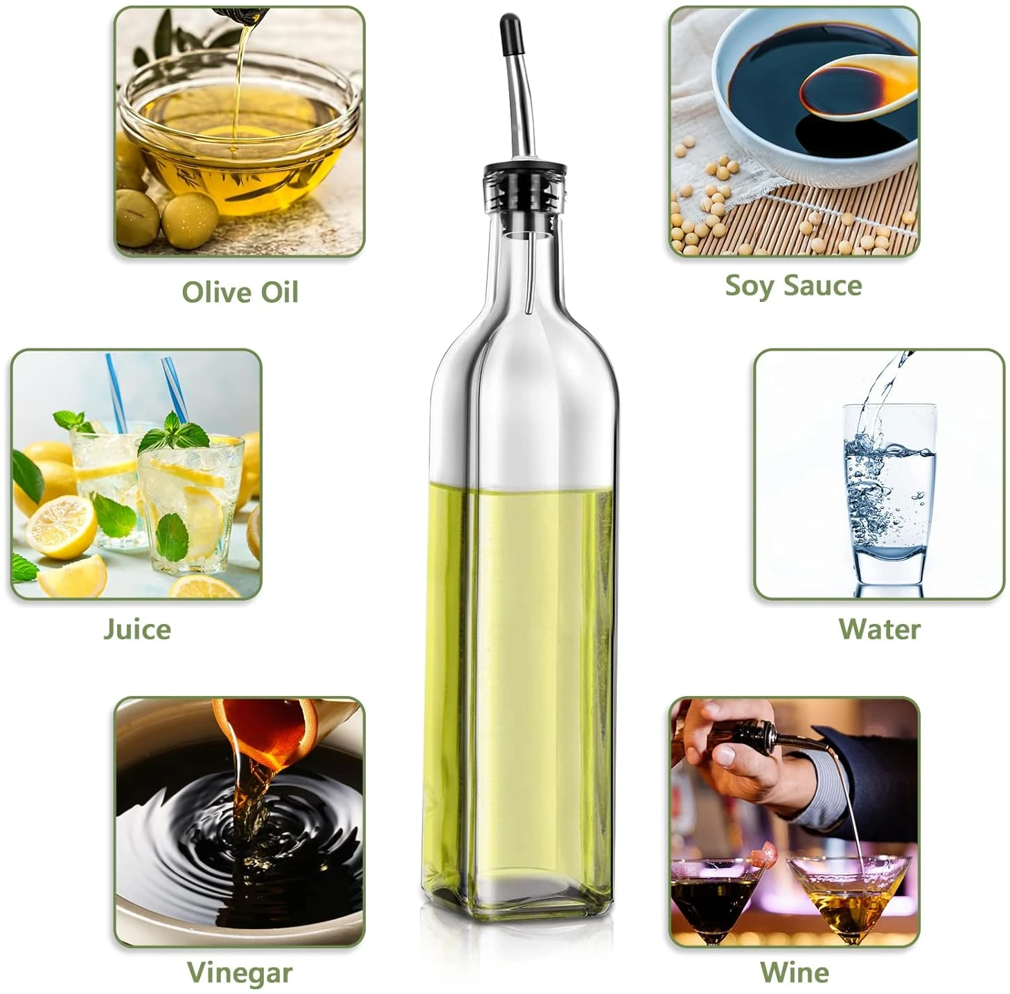 - WIDELY USED : Olive oil bottles can hold cola, vinegar, wine, chili oil, Italian glass oil, and vinegar sauce, not only for salad dressing, cooking, barbecue, but also for mixing your chili oil with this bottle.