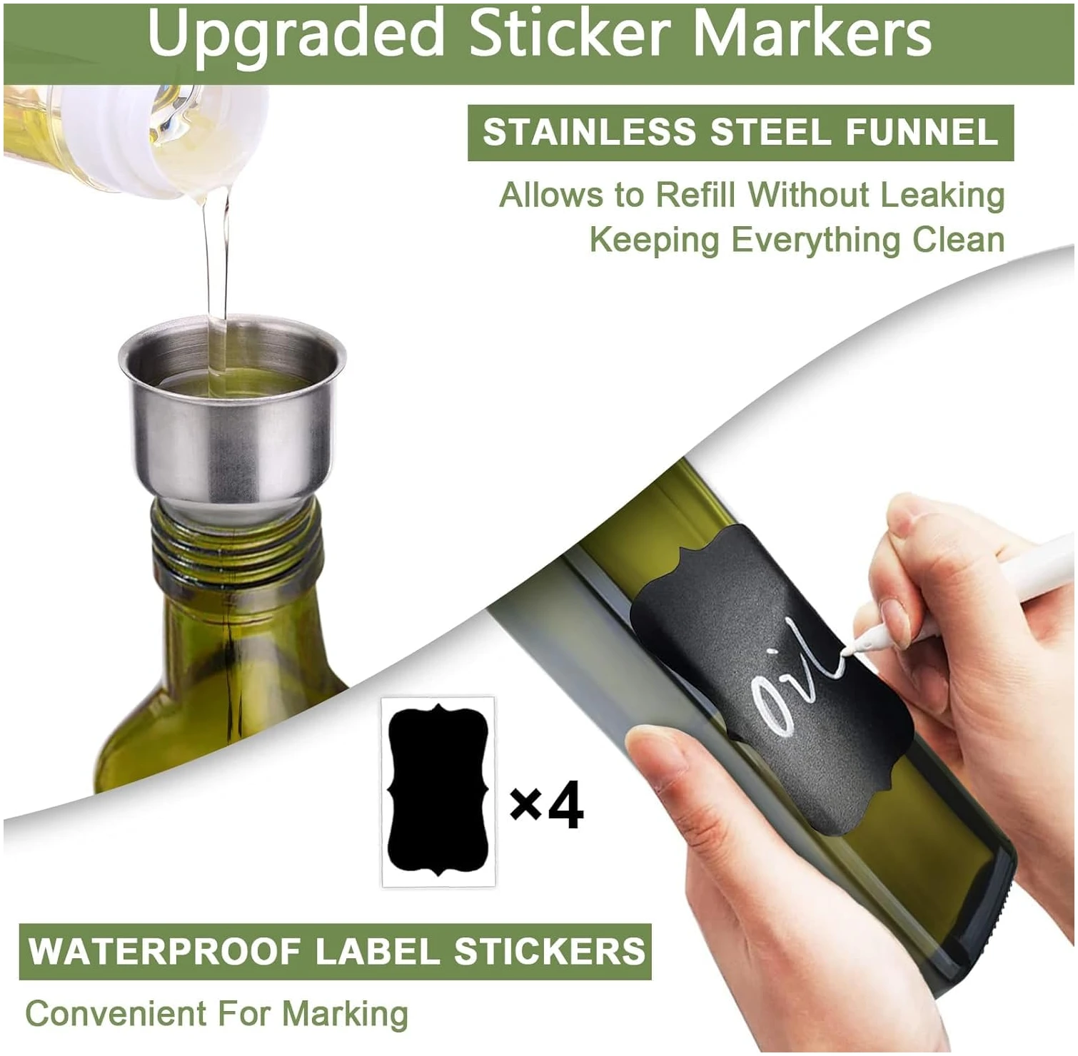 - PRACTICAL STAINLESS STEEL SPOUT : The olive oil bottle has 2 different 18/8 stainless steel nozzles with a sealing cap and cap, making it perfect for bottles and perfect for dust prevention. Both men and women can effectively control the flow rate of olive oil to ensure that it does not leak. Perfect for preparing edible oils, seasonings, and vinegar. You can replace it as needed.