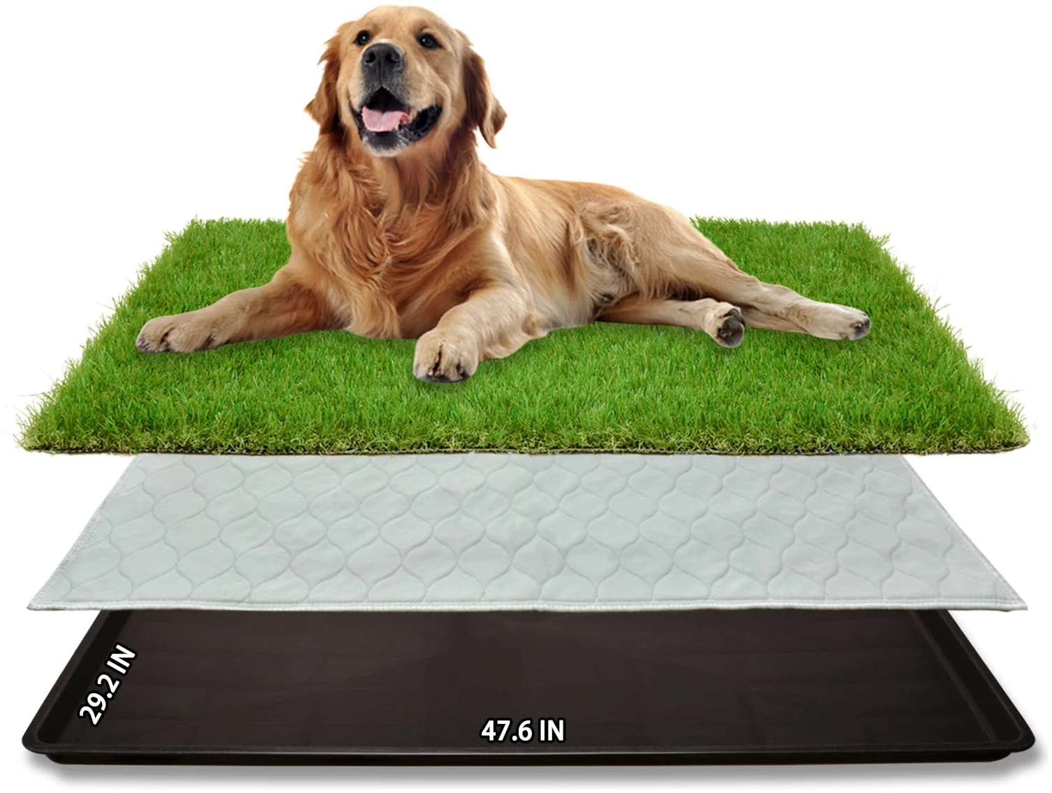 - INDOOR/OUTDOOR POTTY SOLUTIONS: Portable potty is a unique solution for pets to have an accident-free life. Perfect for times when you’re late coming home to let the dog out, or unable to let your pet outside due to illness or bad weather. The pet potty large size 47.6″ x 29.2 ” makes it ideal for medium and large dogs and it is weather proof, so you can leave it outside on the patio or balcony. Non-toxic and safe to use around your pet.