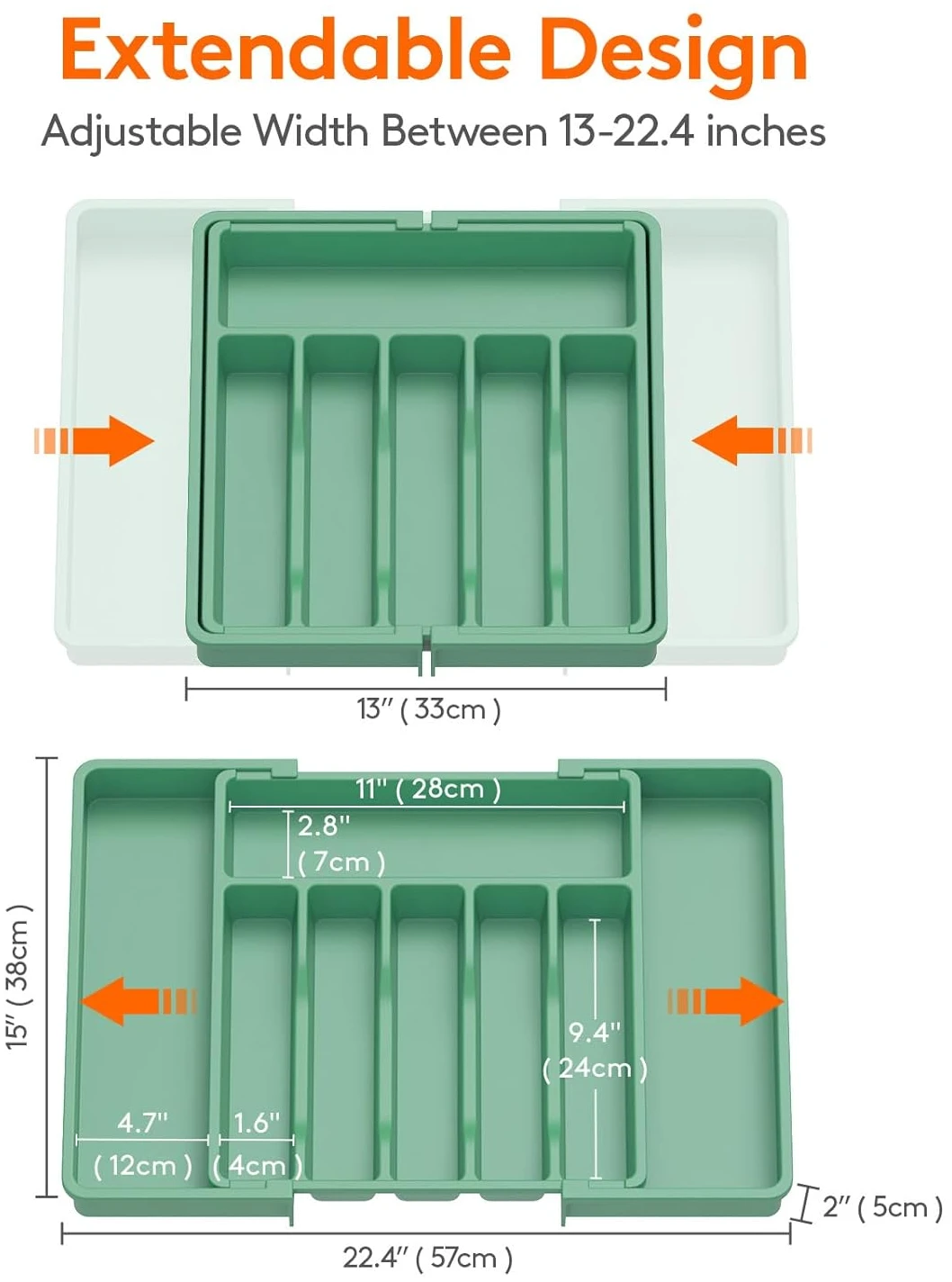 - Adjustable Size: With an adjustable width between 13 – 22.4 inches, it is compatible with different drawer sizes. When fully expanded, the cutlery box dimensions are 22.4 x 15 x 2 inches and when fully folded, it reduces to 13 x 15 x 2 inches. So no matter what size your kitchen drawers are, this utensil organizer will surely fit in