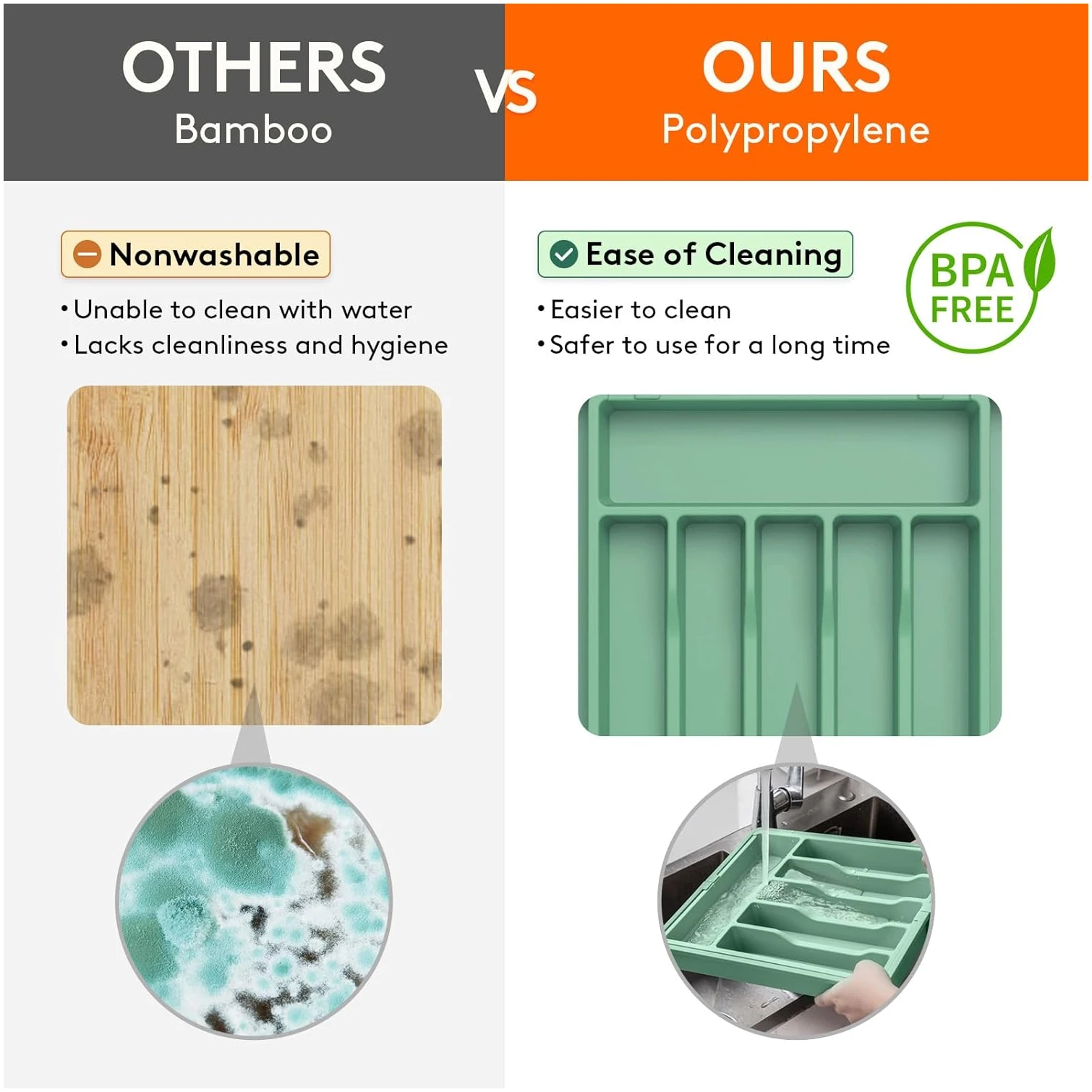 - Premium Material: Made of thick and sturdy premium PP material, the cutlery organizer is BPA free so you can rest assured that it is safe to use with all forms of tableware. The durable construction means it is built to last for a long time