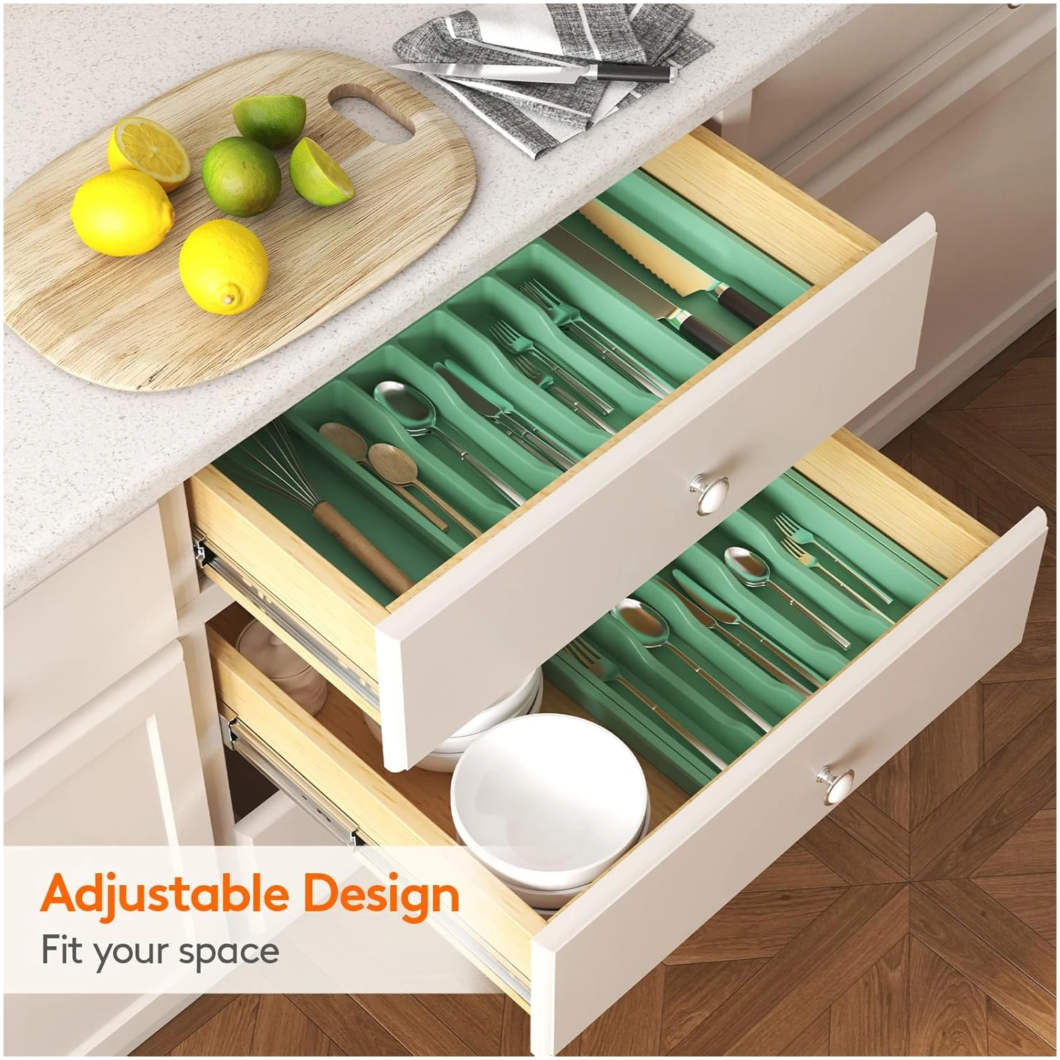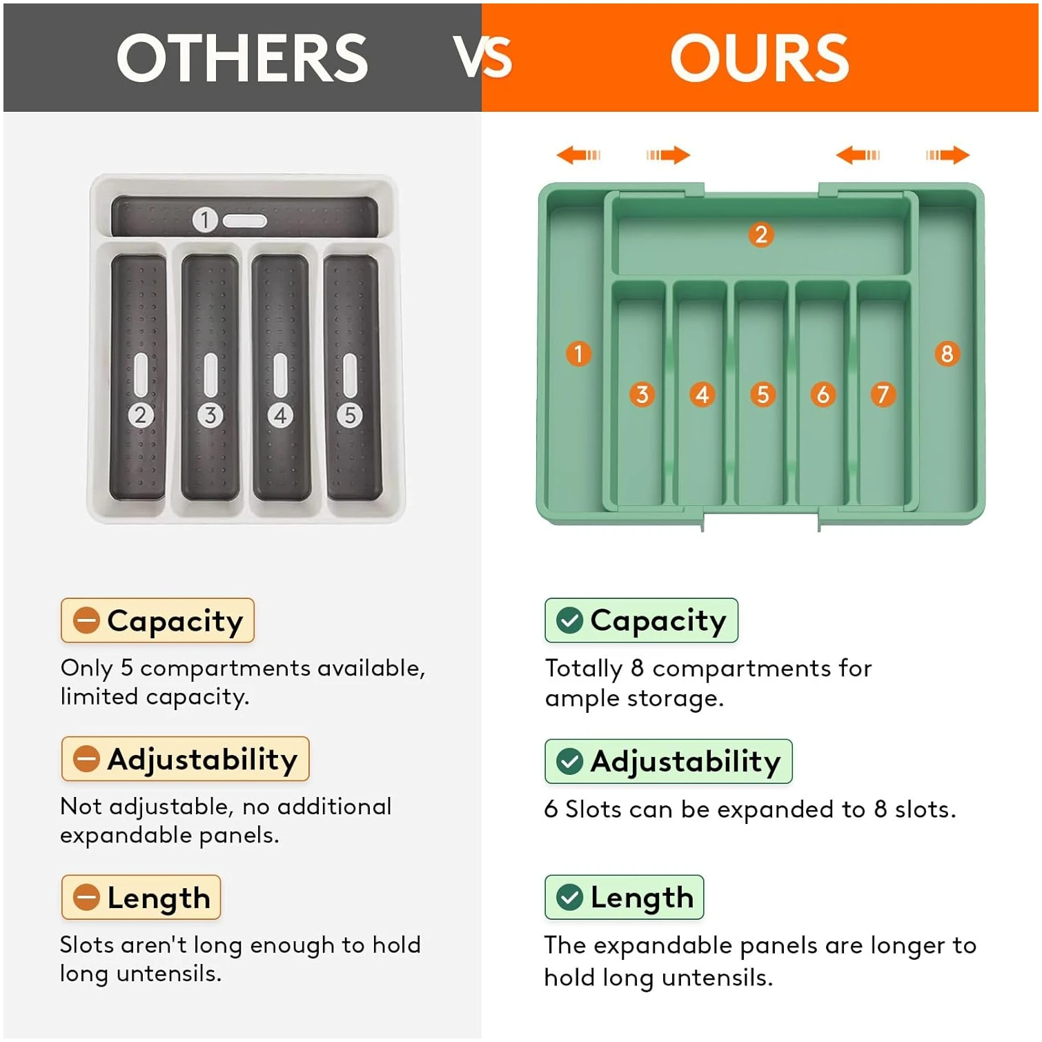 - Large Capacity: Organize your kitchen drawer and make more space with the this silverware organizer. Comes with two expandable panels on the left and right to store more silverware, cutlery, and kitchen utensils