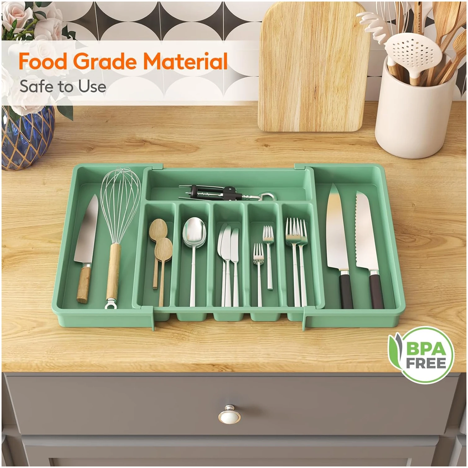 This expandable silverware organizer is a great way to keep utensils tidy and easily accessible. The adjustable design makes it easy to fit different drawer sizes, and the BPA-free material feels sturdy and well-made. It holds everything in place without shifting, making kitchen organization effortless!