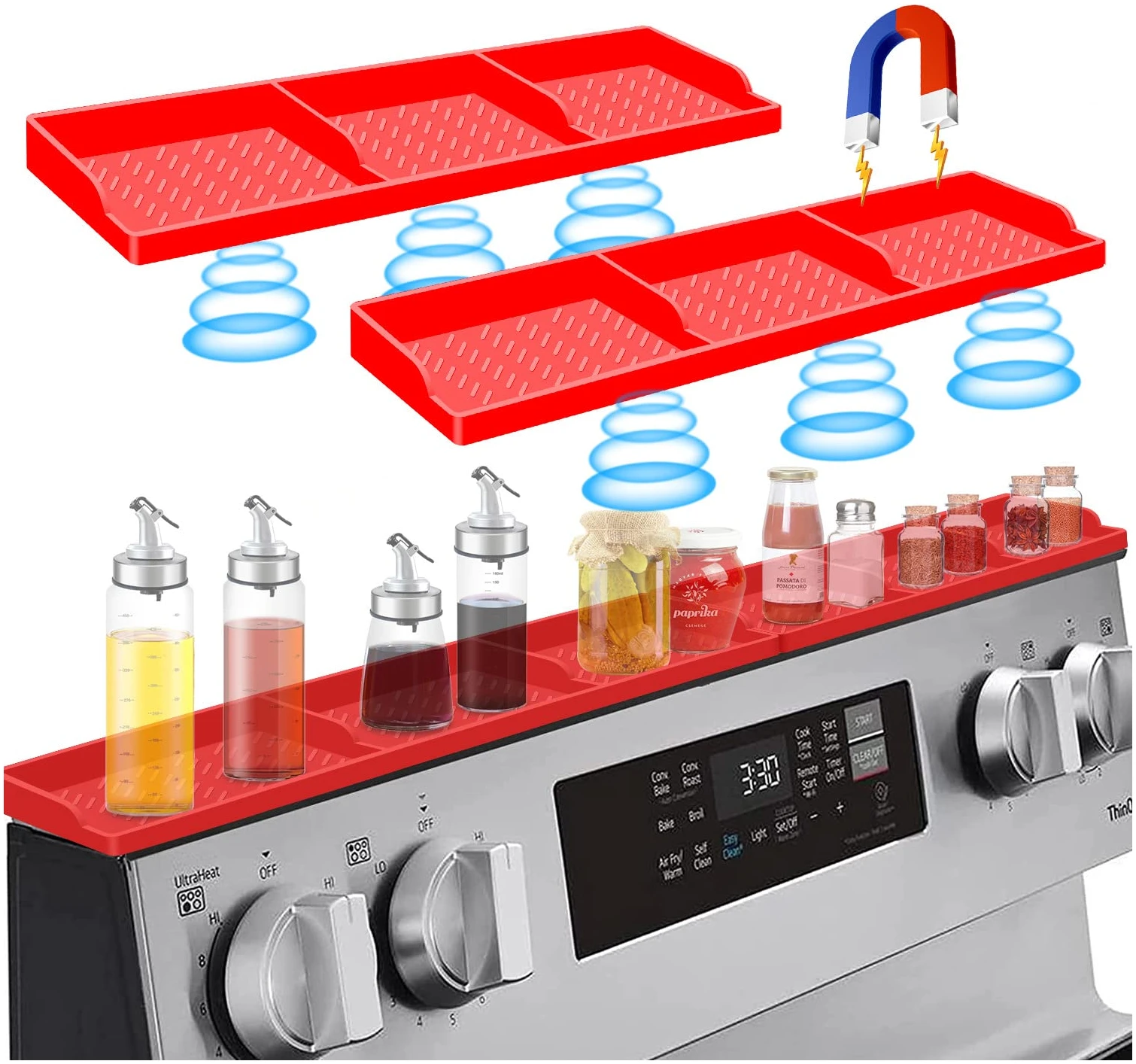 - 【Stay in Place】Silicone magnetic shelf for stove hold things on the back of stove securely and in place. your stuff won’t fall down to the stove any more when you open and shut the stove door, bump. also helps block things from falling behind the stove.