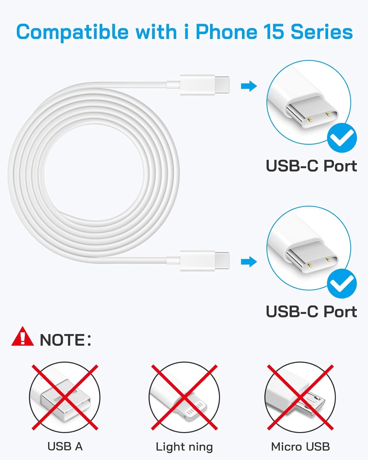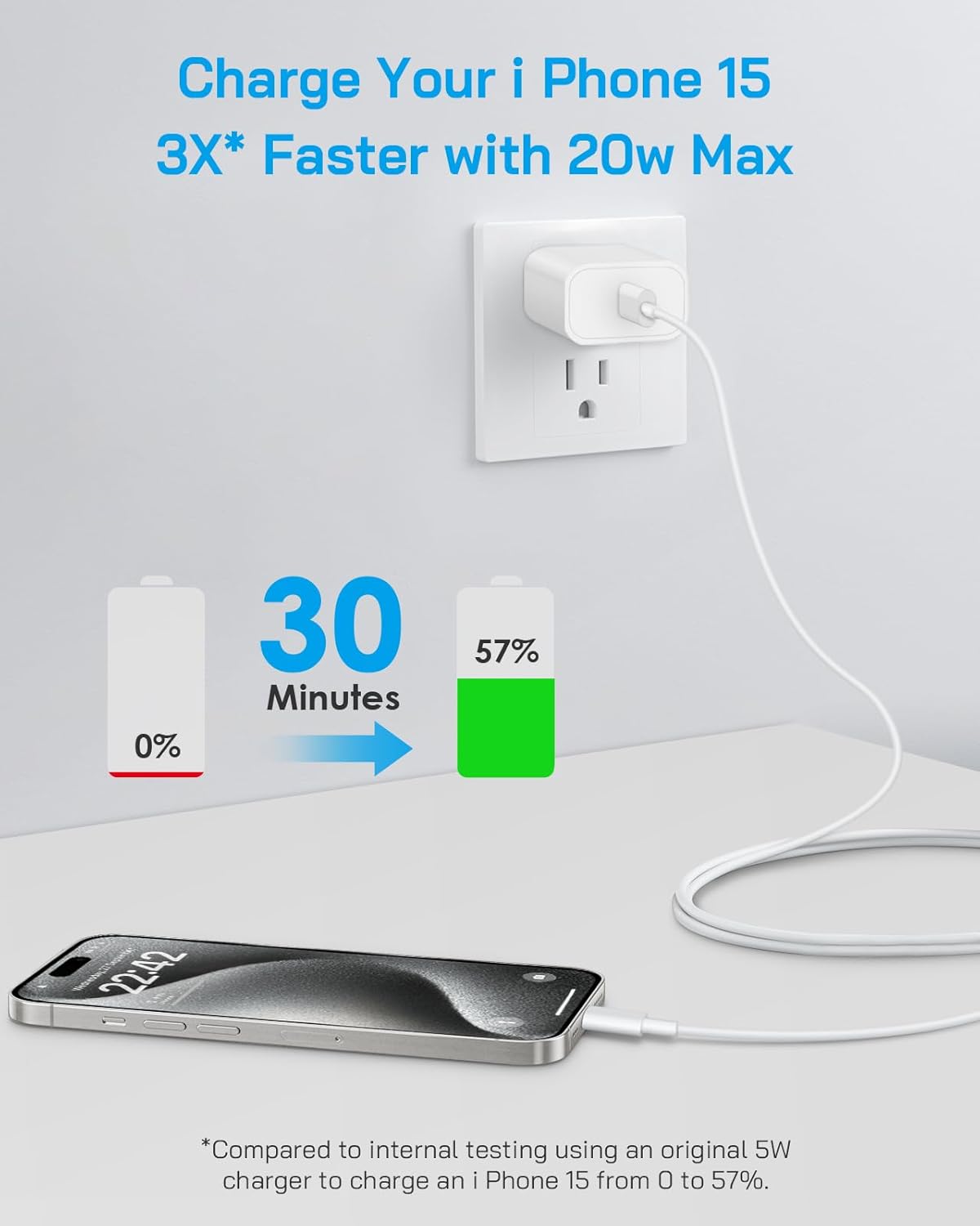 - [Fast-Charging Charger for i Phone] This charger block supports 20W charging, meaning you can charge your i Phone 15 / 16 to 50% in just 30mins–3x faster than the 5W original charger, and the 6ft USB-C to USB-C cable–2x longer than the original one, gives all your outlets easy accessibility.
