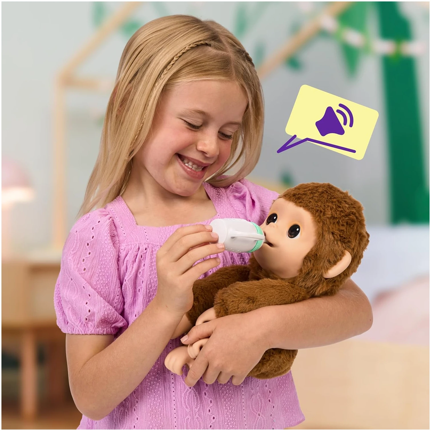 可爱又有趣的小猴子!我的孙女太喜欢她的小猴子了,她想要一个双胞胎。它棕色的毛柔软舒适,很适合抱抱和玩耍。小猴子会发出可爱的声音,还会喝奶瓶。