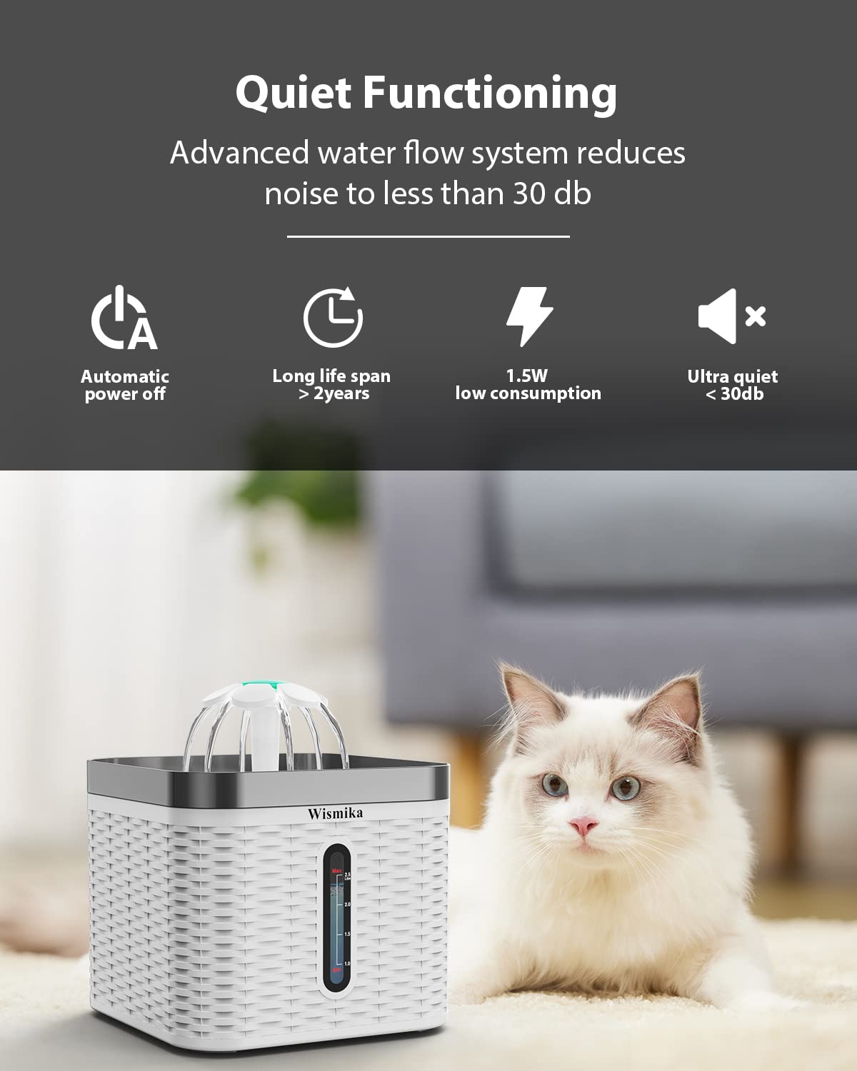 我和我的猫都很喜欢这个饮水器。它超级可爱,编织篮筐的设计、花朵状的出水口以及自带的橡胶垫。它运行时非常安静,没有水花飞溅的声音,而且电机的噪音非常小,晚上几乎听不到。