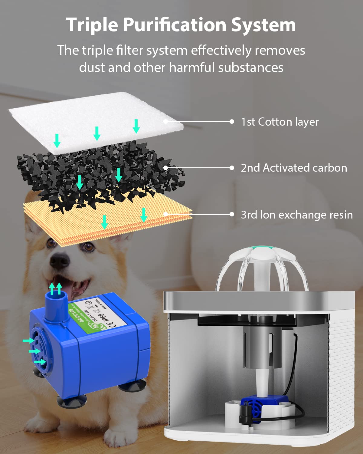 • 【三重过滤系统】包装内含3个猫饮水器过滤器,三重过滤系统可去除水中的宠物毛发和异味,保持流水清新健康。(我们建议每1-2周清洁一次过滤器和水泵)