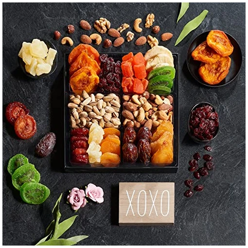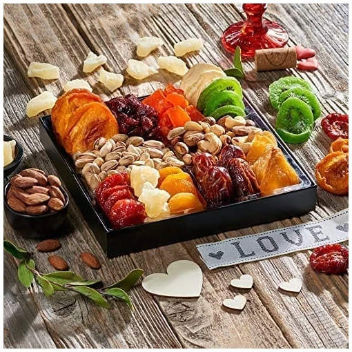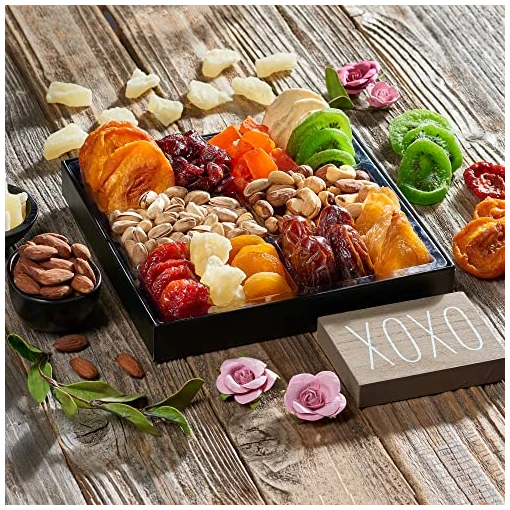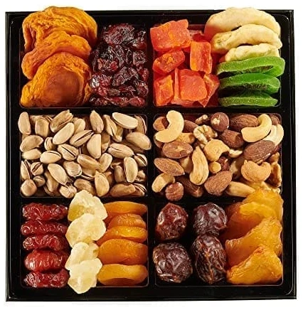 - 干果礼品篮:我们的分体式派对托盘装满了健康食品。带盖托盘分为 6 个隔间,方便您取用。每个隔间都包含我们各种令人垂涎的干果或坚果:混合坚果、土耳其咸味开心果、苹果干、猕猴桃干、加州桃子、梨干、美珠枣、土耳其杏、菠萝碎、安吉利诺红李子、木瓜块和葡萄干